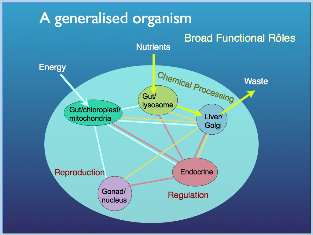 This gives us the idea of a generalised organism (above), in which a set of essential functional roles are present and interlinked in a particular (functional) way to form a coherent whole. There is something obviously missing from that diagram - can you think what it is? Reward yourself if you thought "there's no boundary": of course there has to be an enclosing boundary or tegument as well. The labelling is a bit difficult when one tries to include all organisms, including prokaryotes, auto- and heterotrophs, single and multicellular, etc., which is why some of the labels are multiple. Gut and liver are obviously not present in plants, but they have their equivalents, at least at the cellular level. Flowering plants have gonads (the flowers and fruits), those that do not, reproduce at the cellular level (vegetatively) where the cell nucleus performs the role... and so on. The important point here is that the wide diversity of aparatus found among organisms for performing these broad functions is, at this level of abstraction not relevant: they are all members of functional equivalence classes. It is only when members of each required class are joined in the right way that a working organism can be created. Joining them in the right way (and keeping it together) is the role of the one part that is represented but not labelled in the diagram. That is the ordered set of interactions which collectively makes up the "operating system" of the organism: the TC that gives it wholeness and organism-level function.